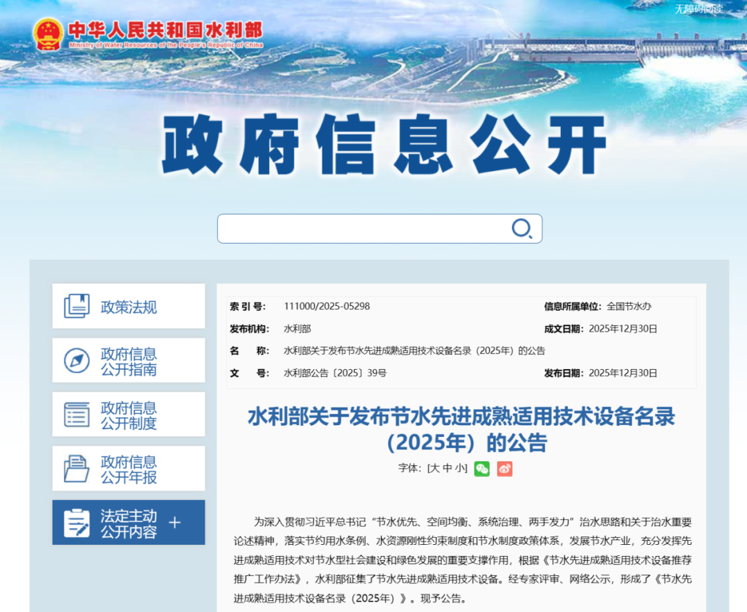 为深入贯彻习近平总书记“节水优先、空间均衡、系统治理、两手发力”治水思路和关于治水重要论述精神,落实节约用水条例、水资源刚性约束制度和节水制度政策体系,发展节水产业,充分发挥先进成熟适用技术对节水型社会建设和绿色发展的重要支撑作用,水利部近日发布《节水先进成熟适用技术设备名录(2025年)》。