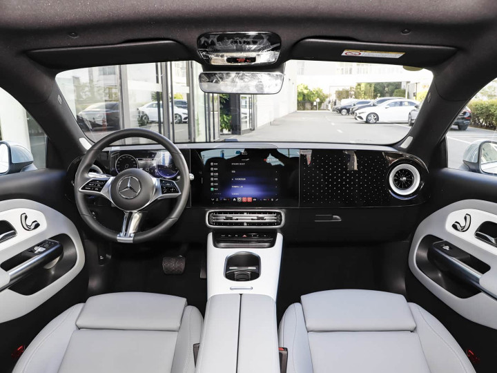 进入车内,CLA EV采用以驾驶者为中心的布局,搭载奔驰最新的MB.OS智能座舱系统,入门版配备10.25英寸全液晶仪表+14英寸中控屏的双联屏组合,高配车型额外增加14英寸副驾娱乐屏,搭配高通骁龙8295顶级芯片,操作流畅度较上一代提升,空间表现方面,2830mm的长轴距带来充裕的后排腿部空间,身高175cm的体验者坐进后排,膝部空间可达两拳以上,接近纯平的地台设计大幅提升三人同乘的舒适性。不过溜背造型导致头部空间仅930mm,高个子乘客可能出现发梢扫顶的情况。